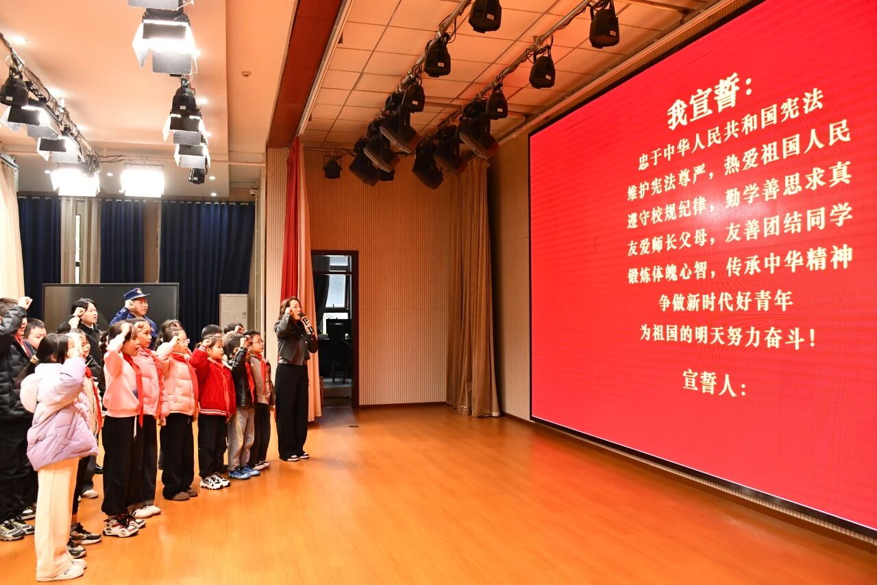 “我宣誓:忠于中华人民共和国宪法,维护宪法尊严……”整齐而坚定的童声在石首市文华小学多功能教室久久回荡。在检察官与消防宣讲员的带领下,孩子们高举右拳,神情庄重,一字一句铿锵有力,传递着他们从小尊崇宪法、守护宪法的决心。